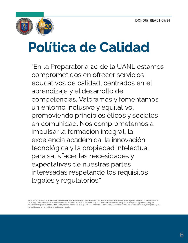 En la Preparatoria 20 de la UANL estamos comprometidos en ofrecer servicios educativos de calidad, centrados en el aprendizaje y el desarrollo de competencias. Valoramos y fomentamos un entorno inclusivo y equitativo, promoviendo principios éticos y sociales en comunidad. Nos comprometemos a impulsar la formación integral, la excelencia académica, la innovación tecnológica y la propiedad intelectual para satisfacer las necesidades y expectativas de nuestras partes interesadas respetando los requisitos legales y regulatorios.